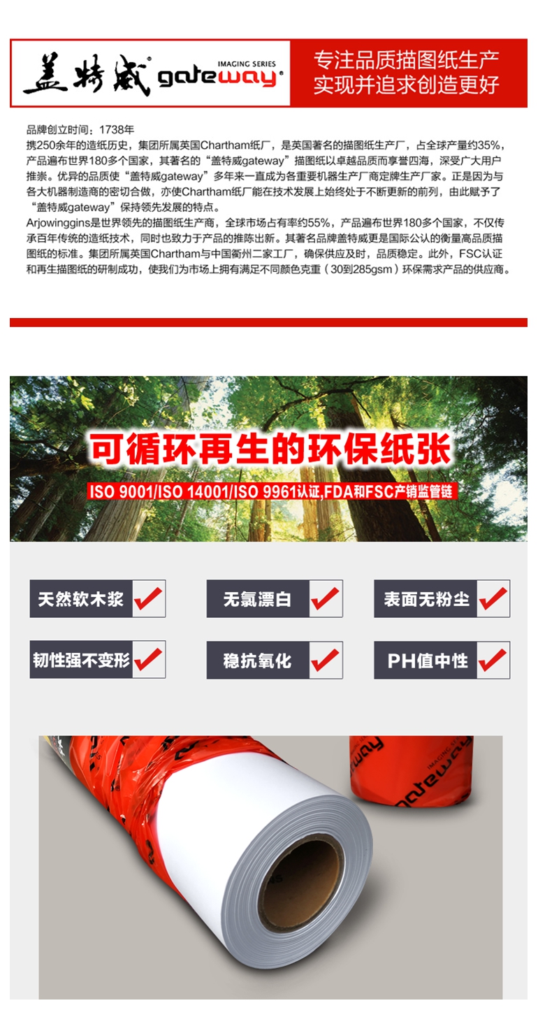 • 商品名称:盖特威(GaiTeWei) A1(620mm*50m)高级卷筒工程绘图纸(2寸管芯)80g/白色5卷/箱