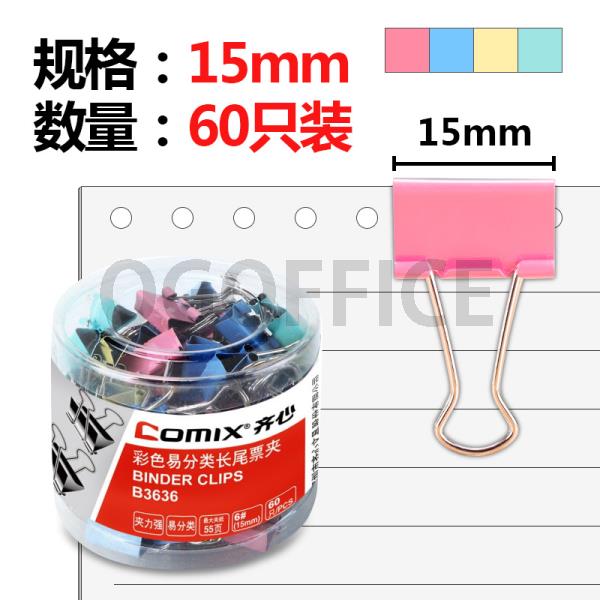 全部产品目录 >办公文具 > 桌面文具 > 票夹>齐心(COMIX) B3636 彩色易分类长尾夹/票据夹/燕尾夹/铁夹子(6#15mm55页)60只/筒装 60筒/件