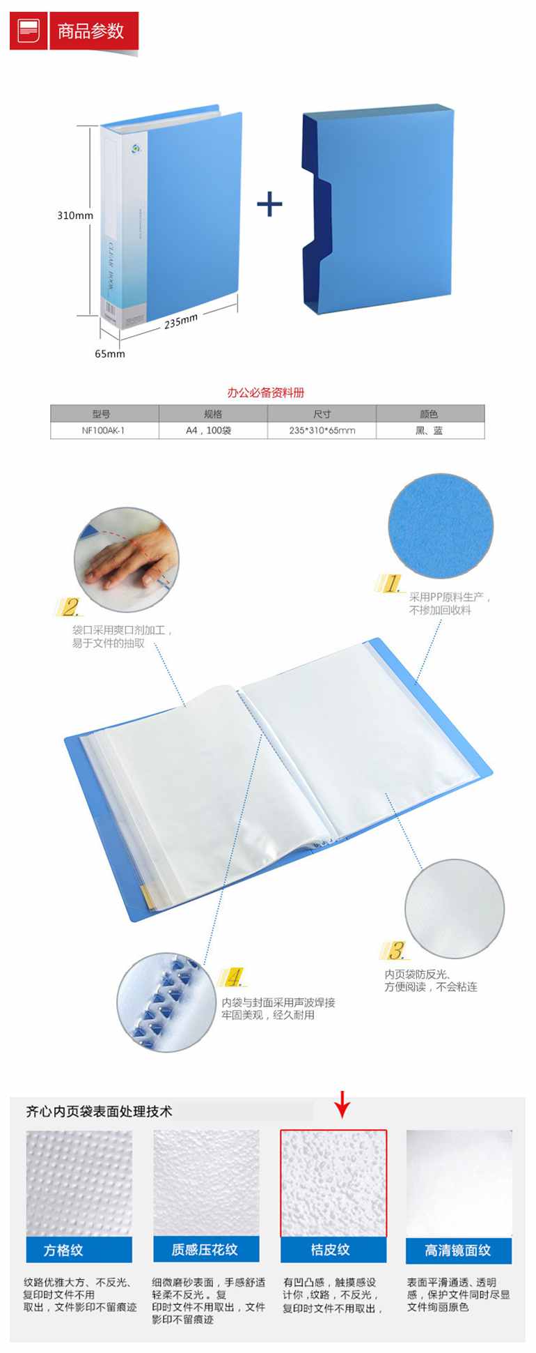 • 商品名称:齐心(COMIX) NF100AK 办公必备大容量资料册A4100袋配外壳8本/小箱16本/箱(黑色)