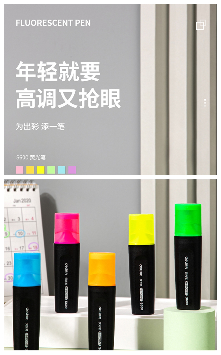• 商品名称:得力(deli) S600 荧光笔彩色醒目标记笔学生重点知识标注红蓝绿淡色记号笔(蓝色)10支/盒