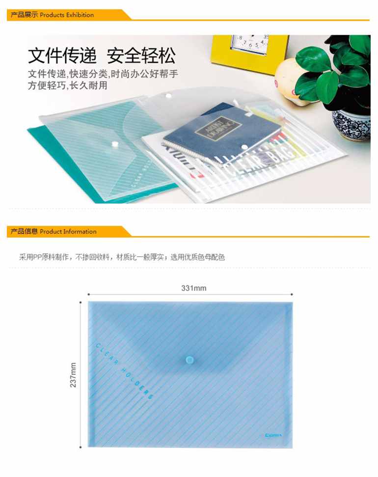 • 商品名称:齐心(COMIX) C330A4透明按扣袋/文件袋/收纳袋蓝色10个/包