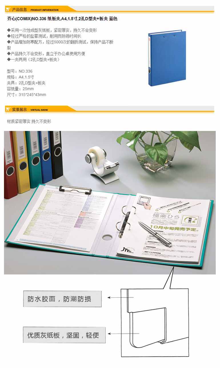 • 商品名称:齐心(COMIX) NO.336 纸板文件夹/A4资料夹/2孔D型夹+板夹8个/小箱(蓝色)