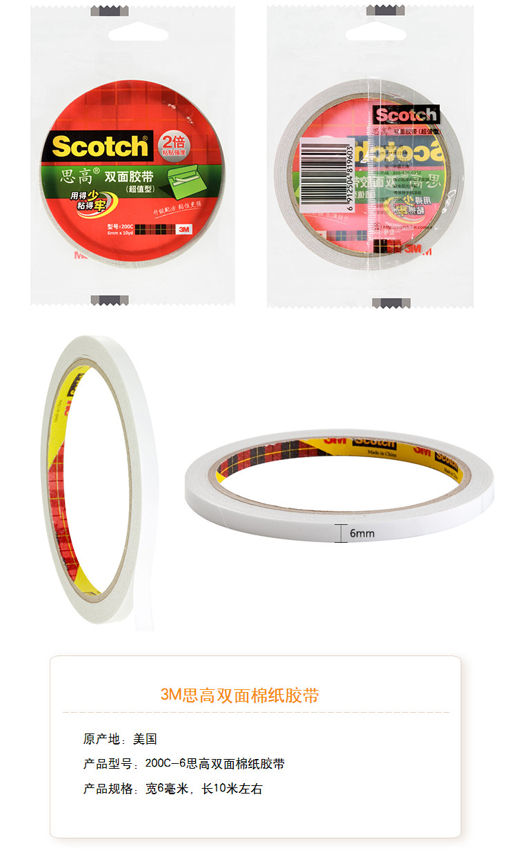 • 商品名称:3M 思高双面棉纸胶带200C6mm*10M双面胶2倍粘力