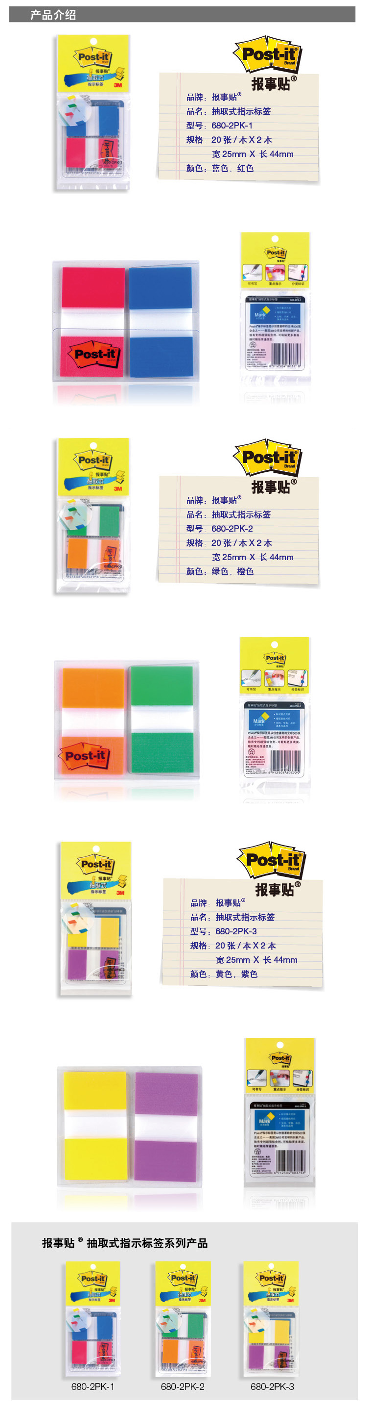 • 商品名称:3M 680-2PK 报事贴/透明指示标签25*44mm(680-2PK-3/黄+紫)