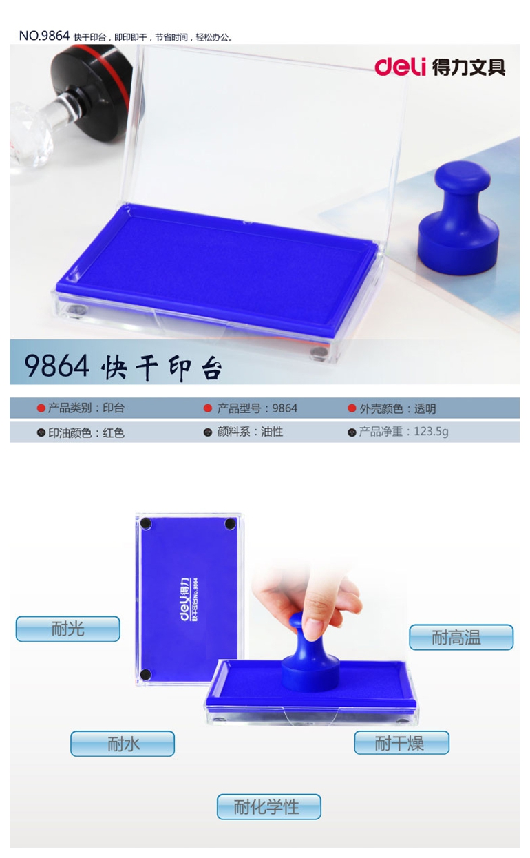 • 商品名称:得力(deli) 9864 方形快干印台蓝色