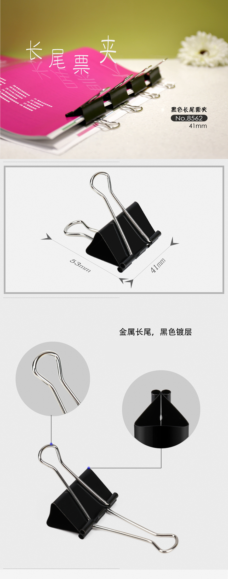 • 商品名称:得力(deli) 8562 黑色金属长尾夹/票据夹/燕尾夹/铁夹子2#41mm24只/筒装