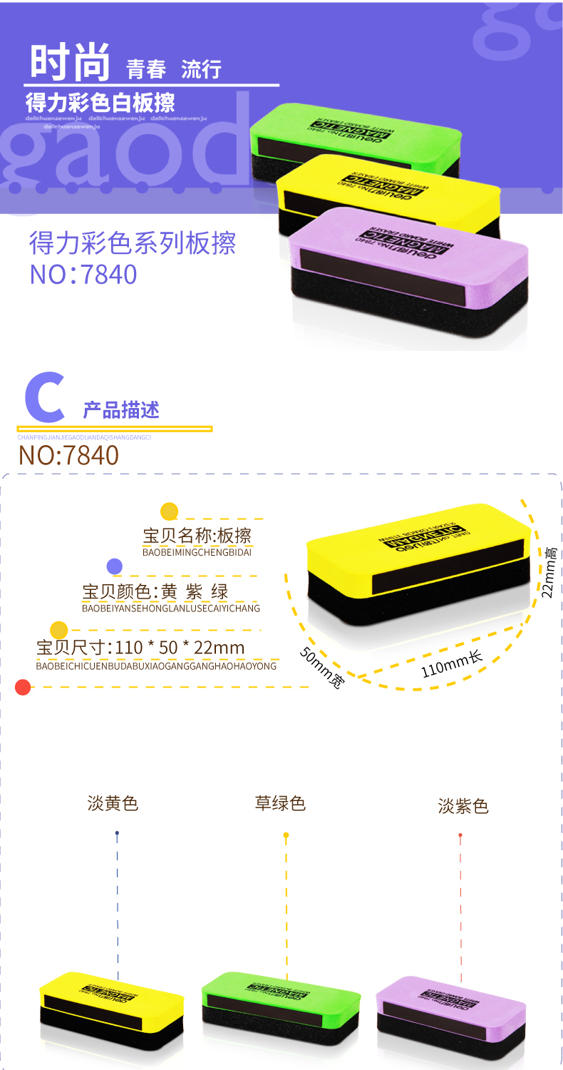 • 商品名称:得力(deli) 7840 彩色白板擦 磁性 150*50*30