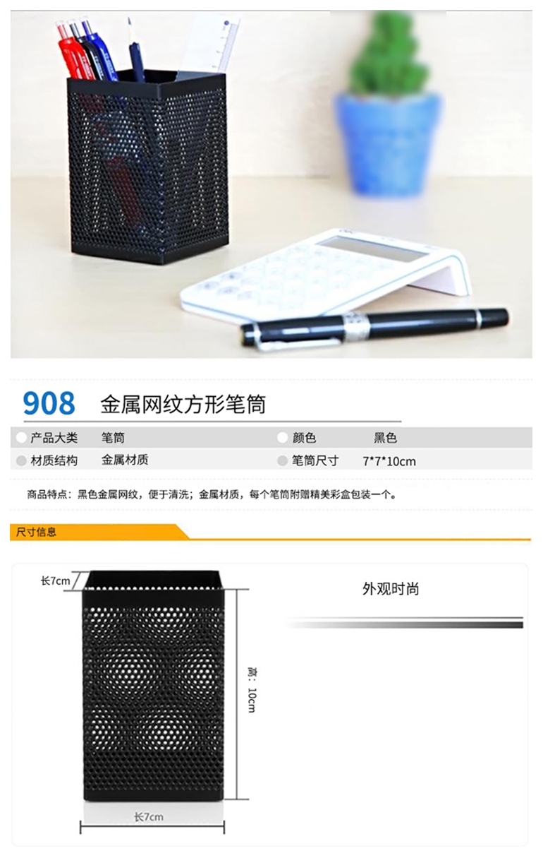 • 商品名称:得力(deli) 908 金属网纹方形笔筒黑色