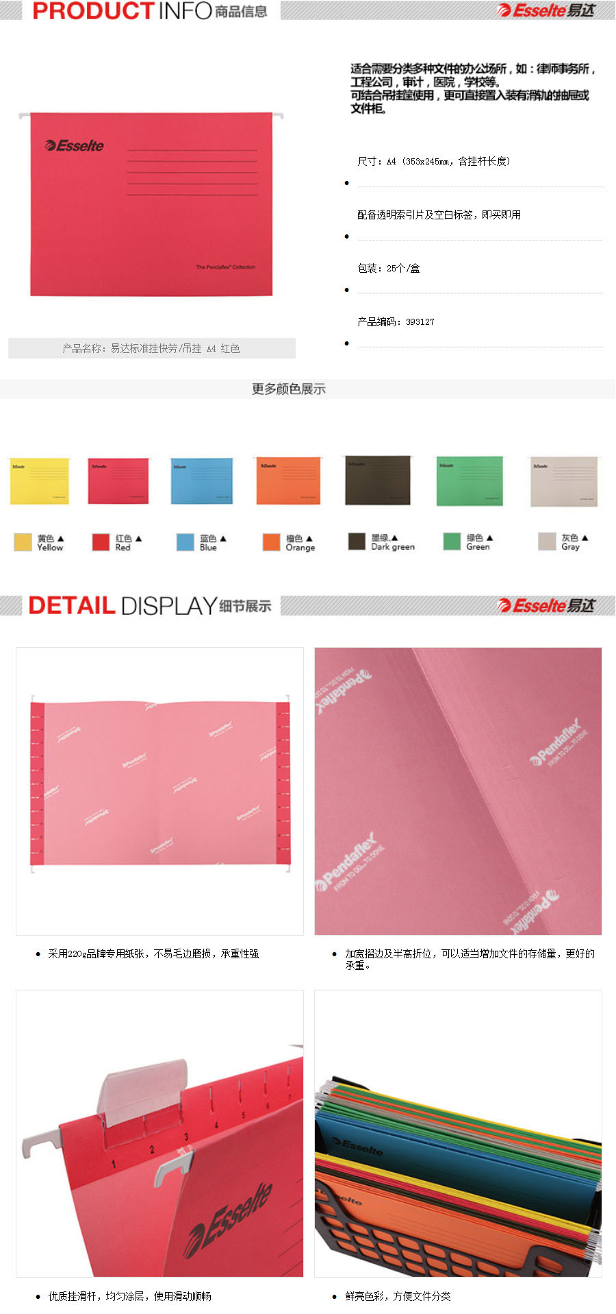• 商品名称:易达(Esselte) 393127 A4挂快劳挂式文件夹快劳夹25个/盒红色