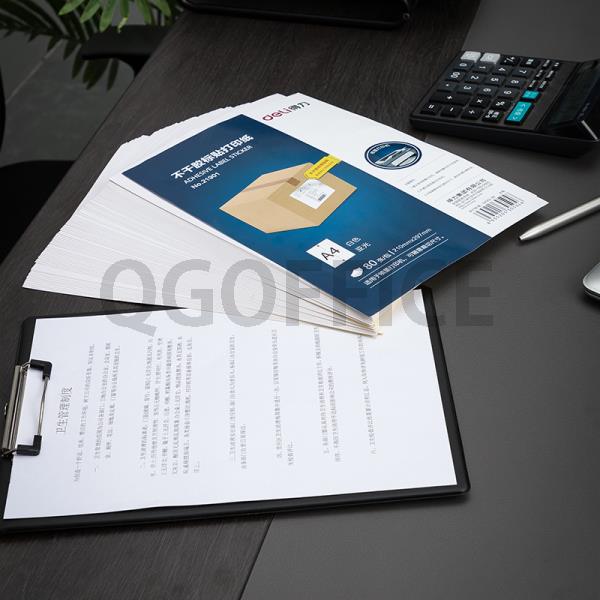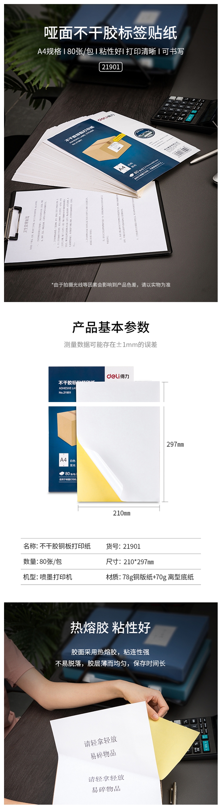 • 商品名称:得力(deli) A4/80张不干胶标贴打印纸 带背胶亚面铜版标签纸 自切割21901