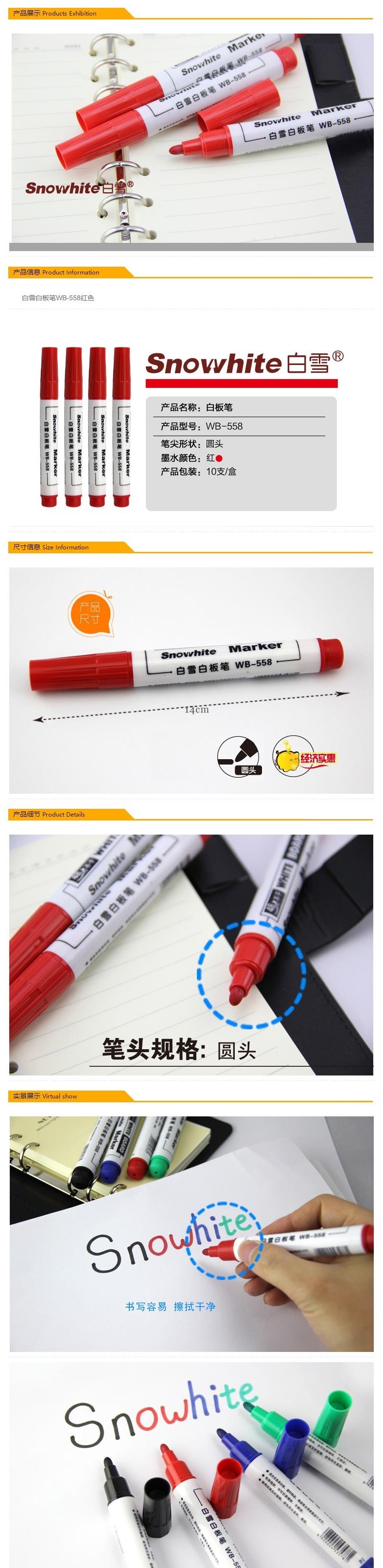 • 商品名称:白雪(snowhite) WB-558 单头白板笔可擦易擦办公记号笔会议笔(10支/盒)(红色)
