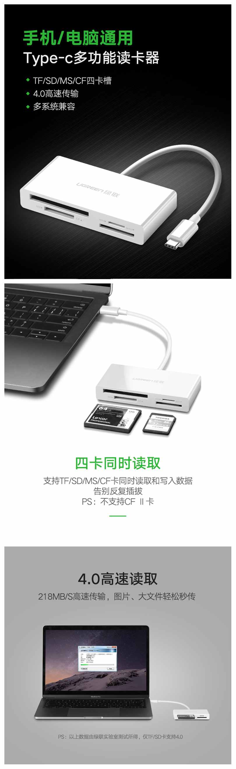 • 商品名称:绿联(UGREEN) type-c读卡器sd大卡tf/cf四卡多合一usb3.0高速通用华为手机电脑两用佳能相机单反内存卡多功能otg读卡器