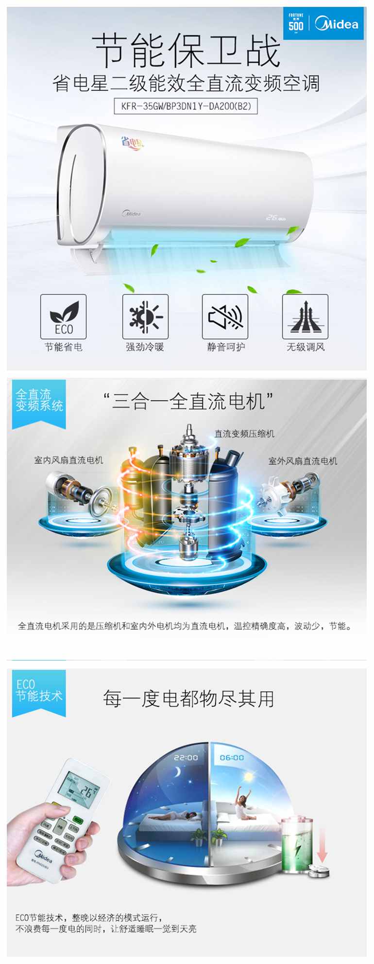 • 商品名称:美的(Midea)1.5匹 变频 冷暖 二级能效 空调挂机 ECO节能 静音 省电星 KFR-35GW/BP3DN1Y-DA200(B2)E