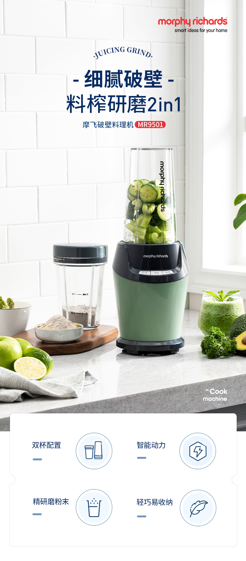 • 商品名称:摩飞 家用多功能料理机绞肉机小型水果榨汁机婴儿辅食搅拌器全自动低音果汁机 MR9501 破壁机 清新绿