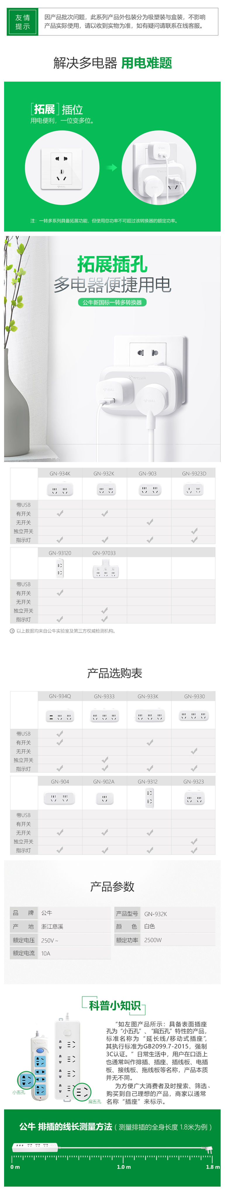 全部产品目录 >日常生活 > 生活用品 > 插线板/转换器>公牛(BULL) GN-932K插线板/转换器