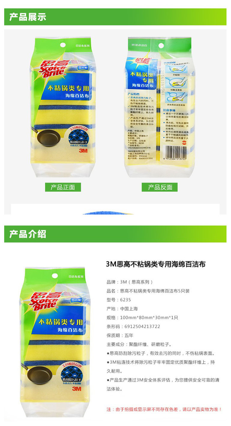 • 商品名称:3M 思高不粘锅类专用海绵百洁布 5片装