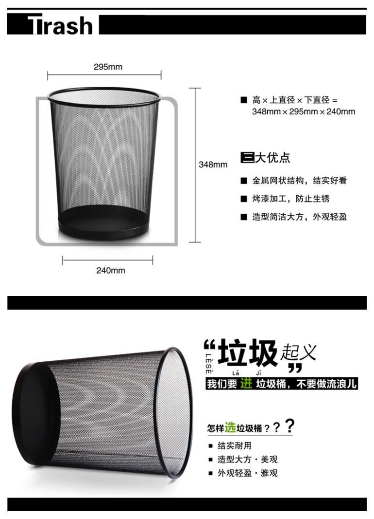 • 商品名称:得力(deli) 9189 φ29.5cm大号金属网状圆纸篓办公家用垃圾桶黑色