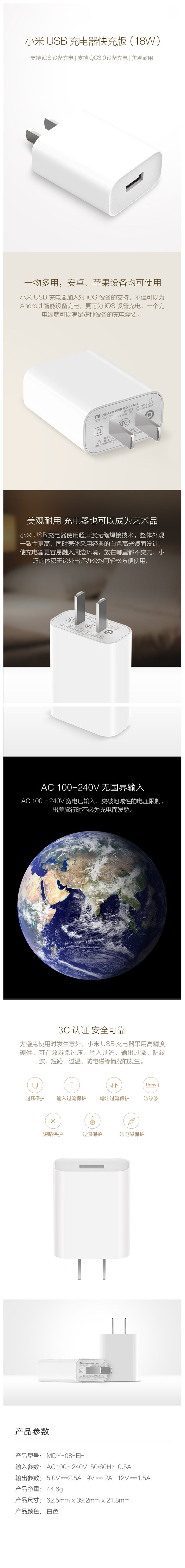 • 商品名称:小米(MI) 18W USB充电器快充版