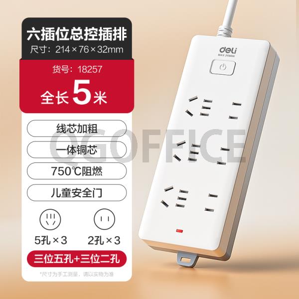• 商品名称:得力 18257 五米接线板 五孔×3 二孔×3