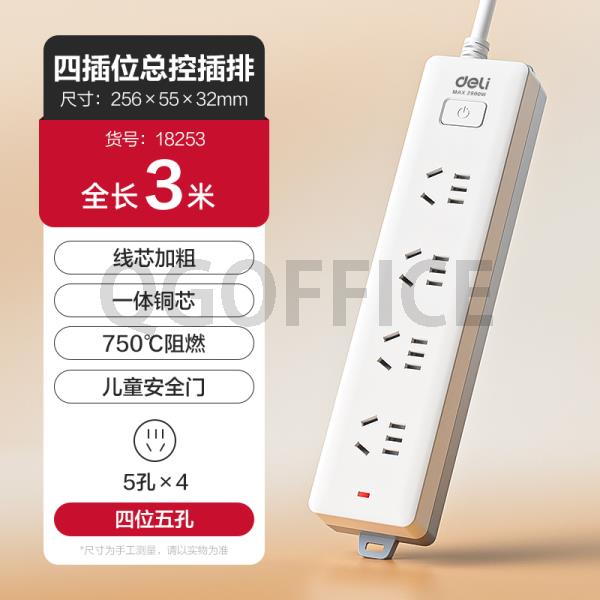 • 商品名称:得力 18253 三米接线板 五孔×4